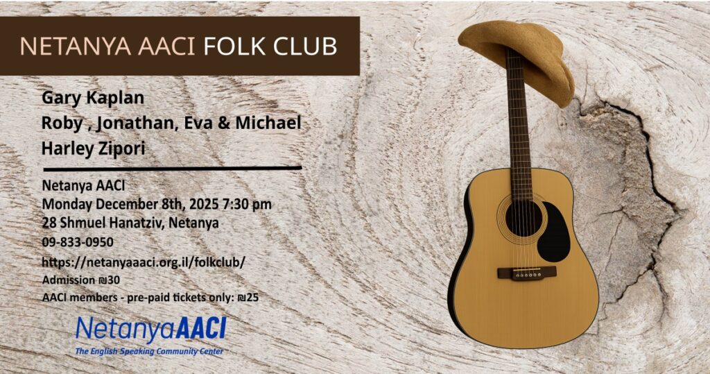Come join us for renewed and revamped Netanya AACI Folk Club. Not to be confused with Cafe Netanya, this is a stage for both promising and established musicians in a friendly environment to share their talents with the music loving community at AACI and in the Netanya area.